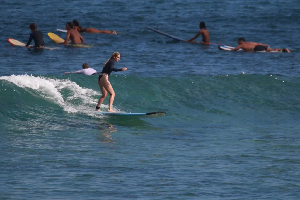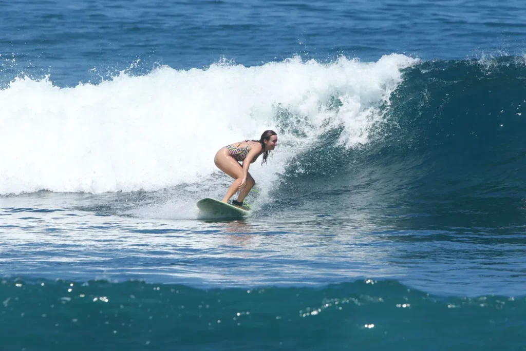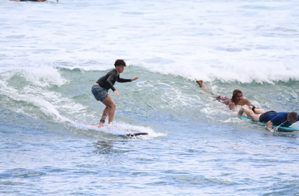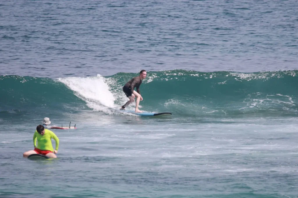 Most beginners stand up within 20–40 minutes during their first surf lesson in Uluwatu, especially at beginner-friendly beaches like Dreamland and Padang Padang.